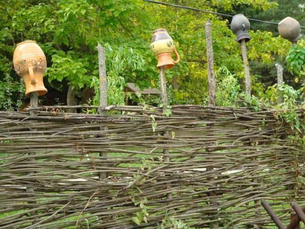 Закончив плетение лозы, стоит начать делать основу конструкции – колья, высота которых варьируется в зависимости желаний хозяина, касательно размеров изгороди.
